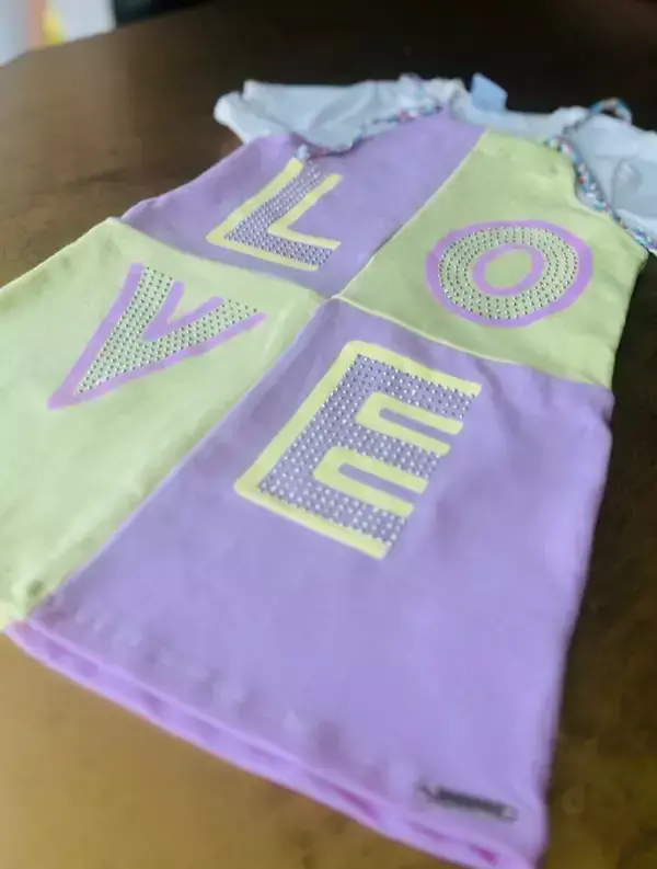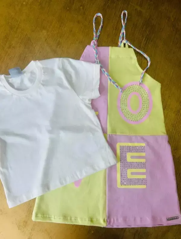 Confeccionada em meia malha macia, a blusa branca possui toque leve e confortável, ideal para o dia a dia. Acompanha uma salopete em molecotton com patchwork nas cores lilás e amarelo, que traz um visual vibrante e divertido. O destaque fica por conta das letras “LOVE” aplicadas na parte frontal, com detalhes delicados que adicionam um toque fashion e encantador ao look.